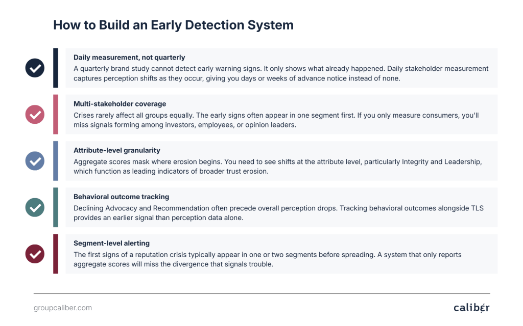 Daily measurement, not quarterly. A quarterly brand study cannot detect early warning signs. By definition, it only shows you what already happened. Daily stakeholder measurement captures perception shifts as they occur, giving you days or weeks of advance notice instead of none.