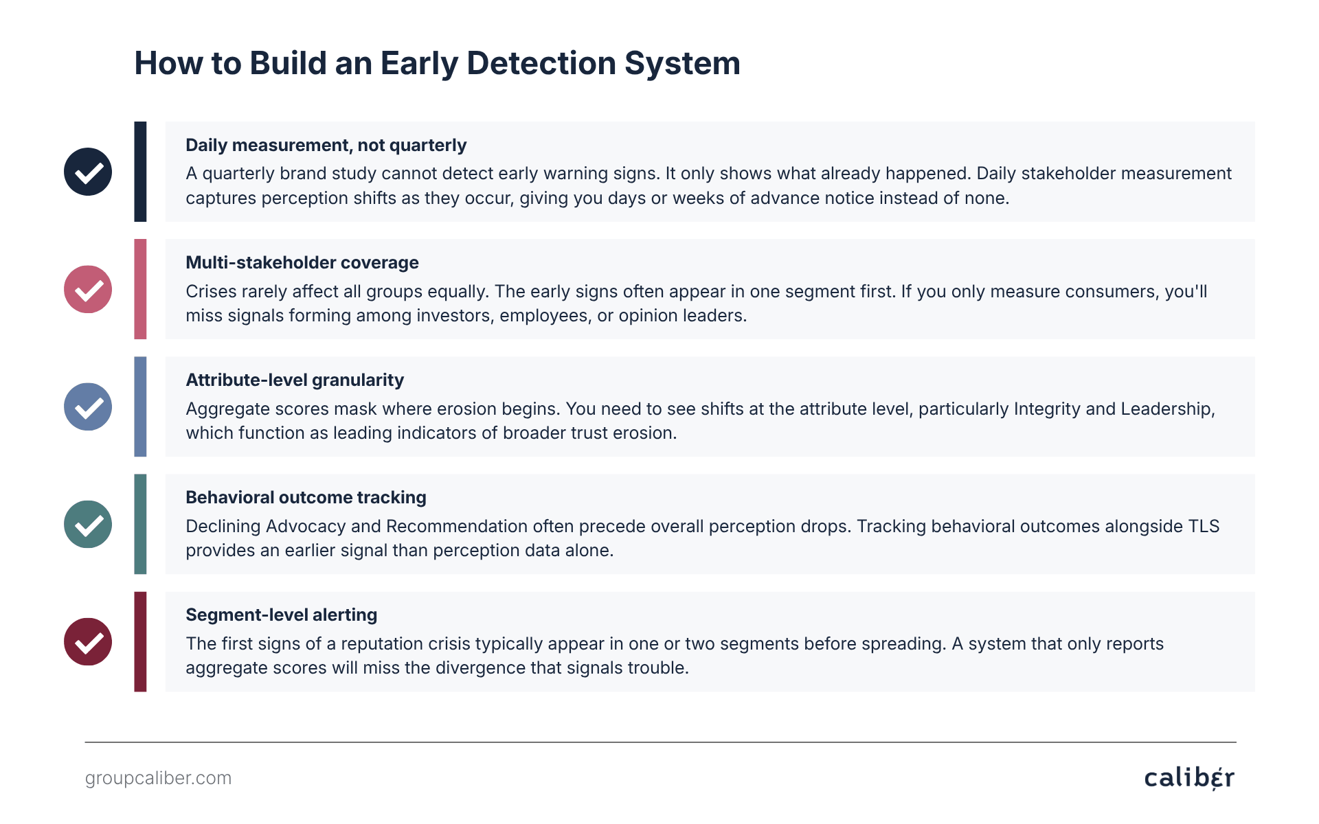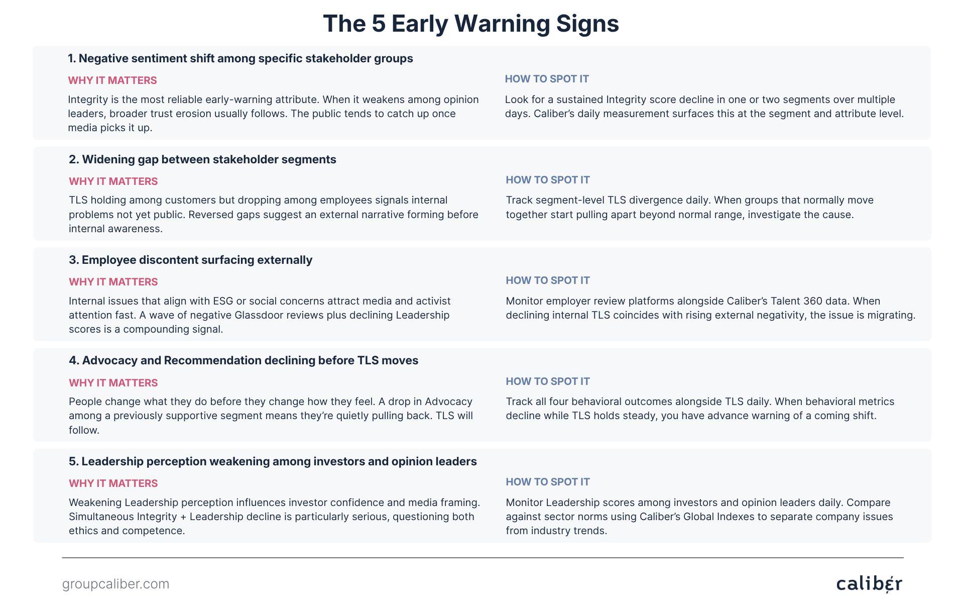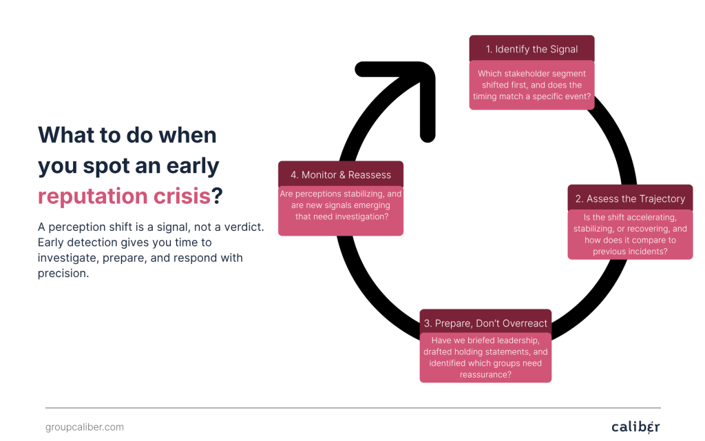 How to spot it. Look for a statistically significant decline in Integrity scores, concentrated in one or two stakeholder segments, sustained over more than a few days. Caliber’s daily measurement makes this pattern visible in near real-time, segmented by group, market, and attribute. Media monitoring alone cannot provide this level of granularity because it measures what’s published, not what stakeholders believe.