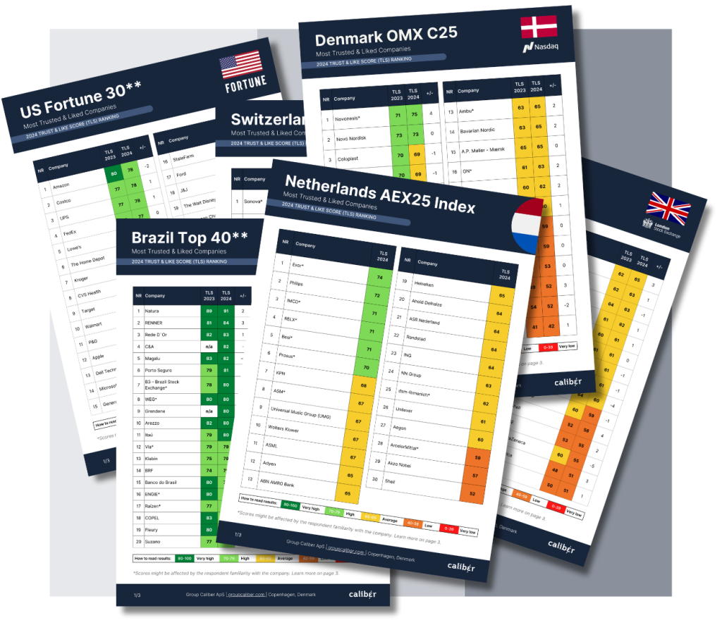 Caliber’s Trust & Like Score Rankings provide a consistent, year-over-year benchmark of stakeholder trust and support. Published annually across 11 markets, they help communications leaders compare performance within each national index and track long-term shifts in trust.