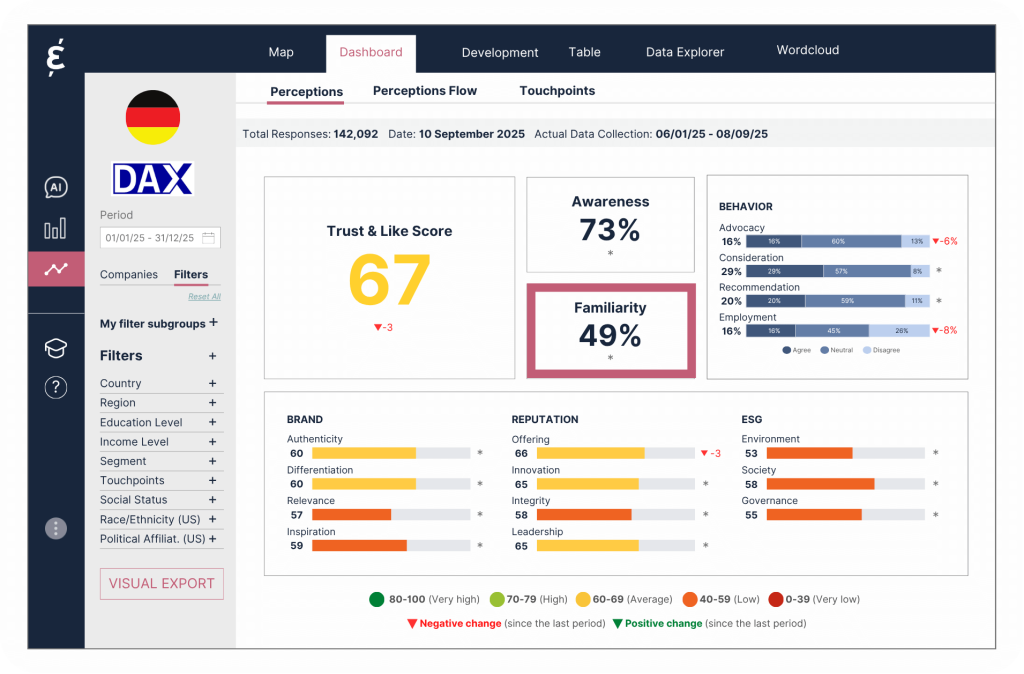 Used to evaluate the top companies in Germany, it’s the clearest indicator of public confidence and overall reputation strength, offering a real-time view of how DAX40-listed brands are perceived by the public.