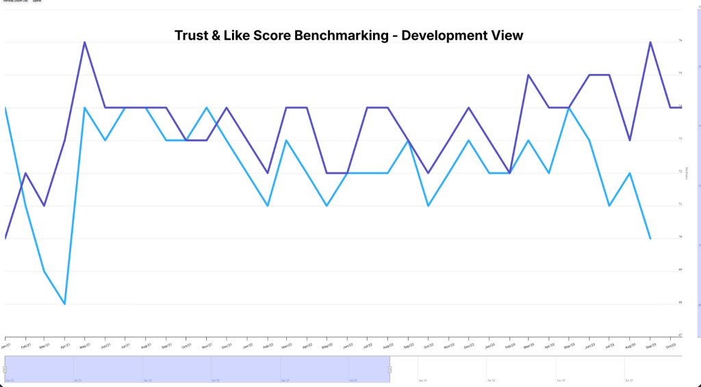 This makes the Trust & Like Score an intuitive “north star” for emotional reputation: a higher score means people feel more positively connected to the company.