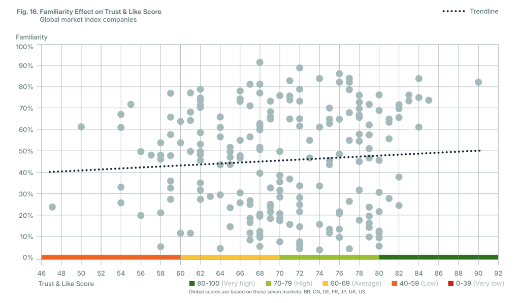 For the inaugural report, we tested two hypotheses. The first was straightforward: the more familiar stakeholders are with a company, the higher their Trust & Like Score
